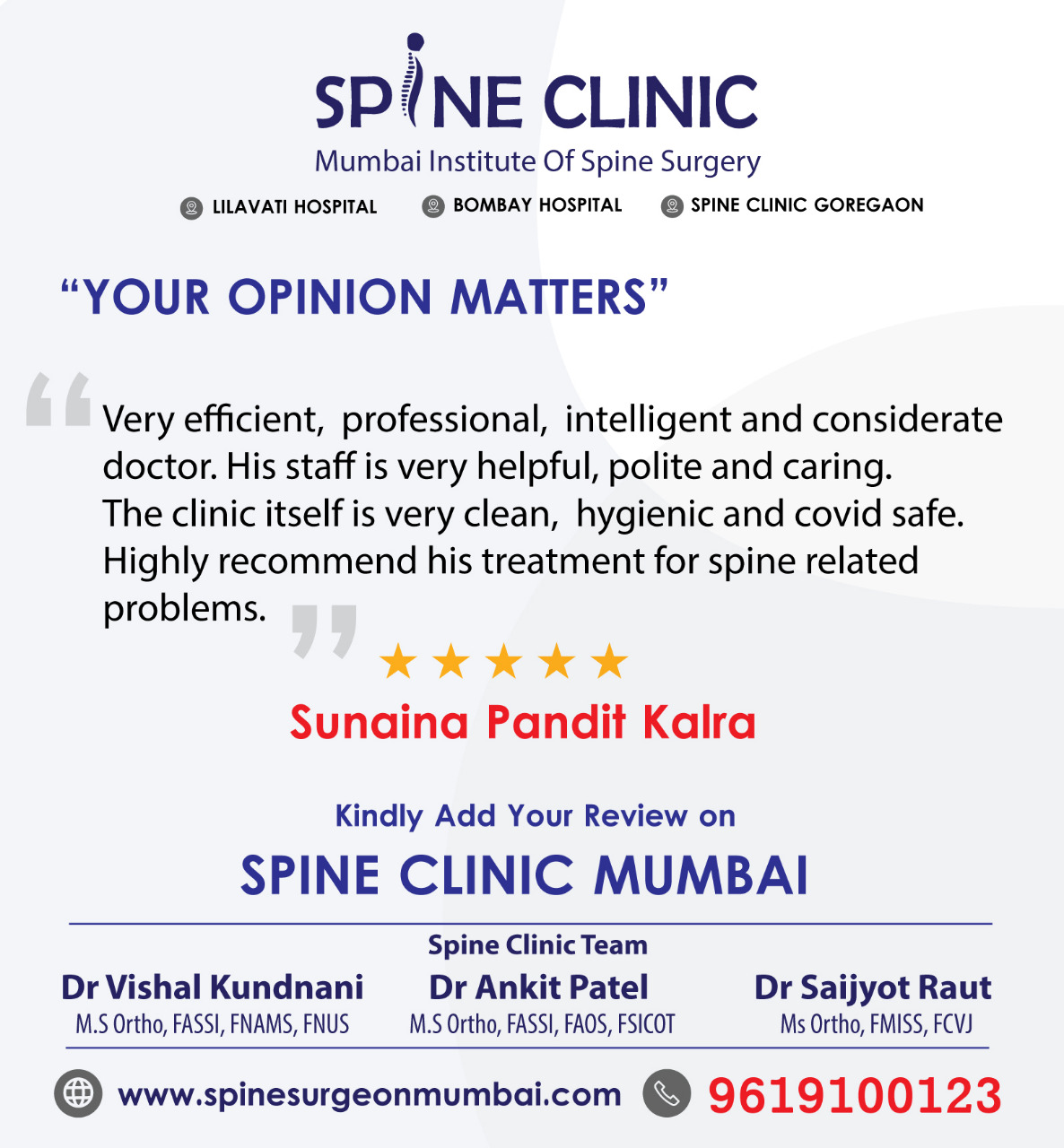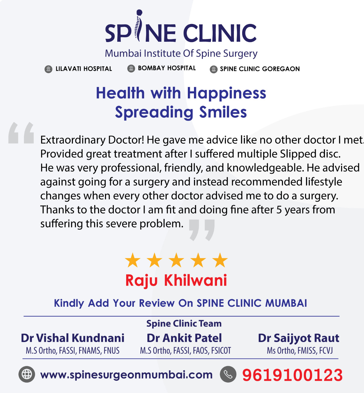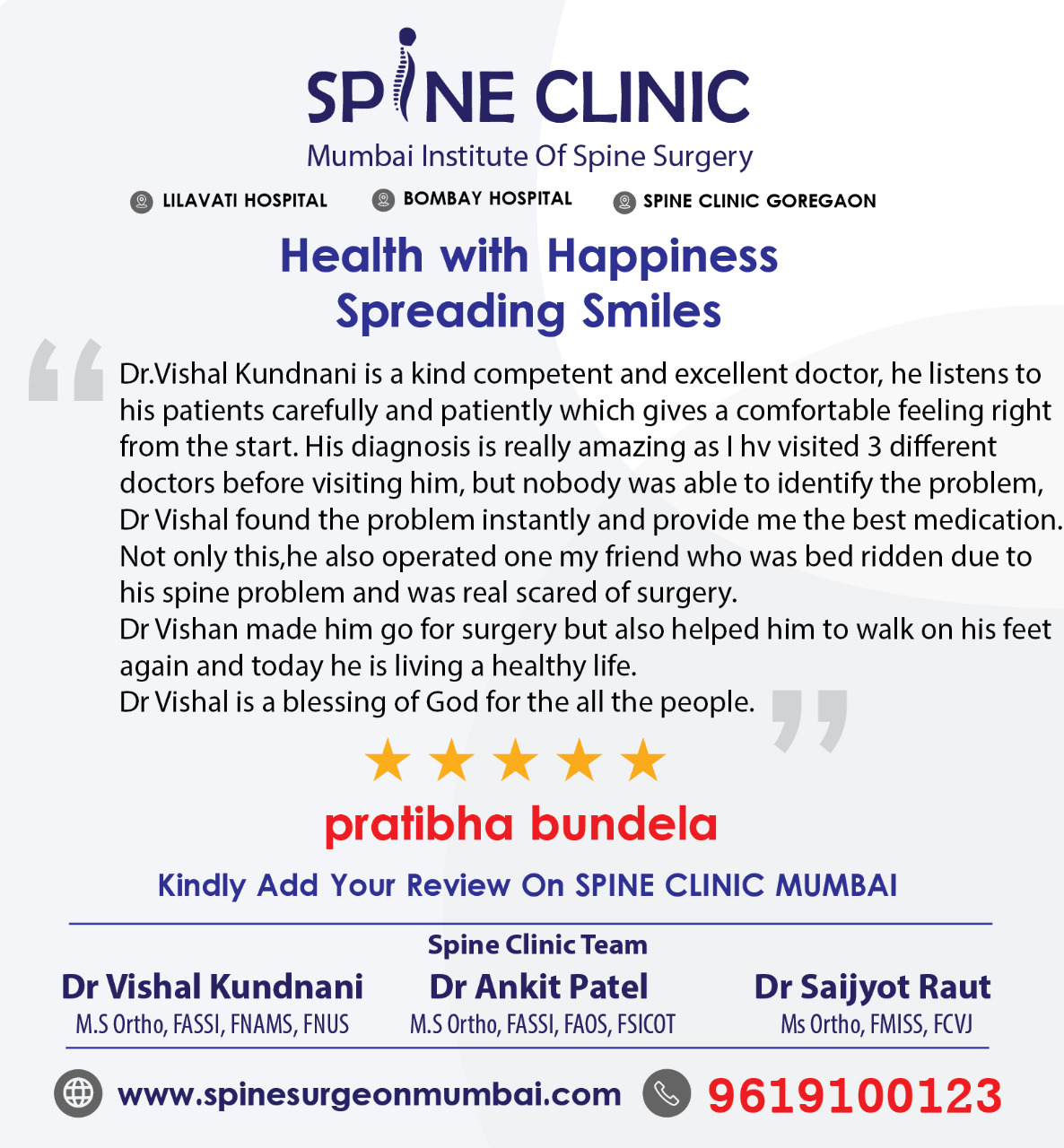 One of the best spine surgeons in India. He heads the SPINE CLINIC – Centre for spinal reconstruction and minimally invasive spine surgery at Bombay Hospital, Mumbai, Shree Narayana Hospital Raipur, Bhopal Fracture Hospital Bhopal. If you are Looking for the best slip disc doctor in Mumbai, Dr. Vishal Kundnani at Spine Clinic offers expert care for slip disc treatment & surgery in Mumbai. Book your consultation today!